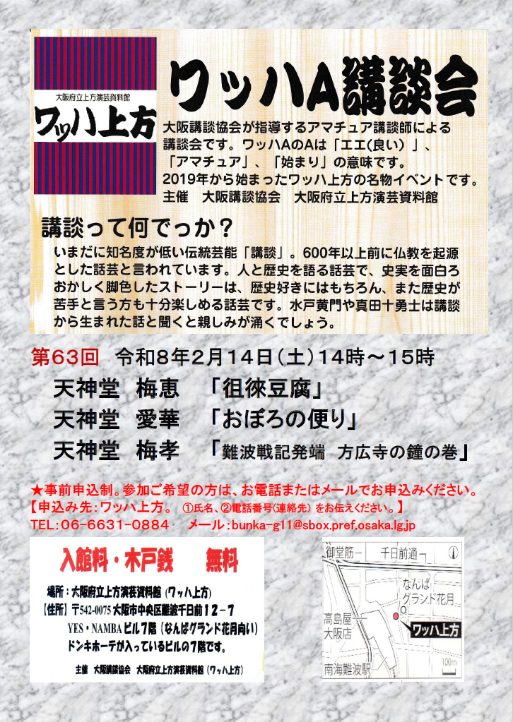【参加受付中】「ワッハA講談会」開催のお知らせ(令和8年2月14日(土曜日))