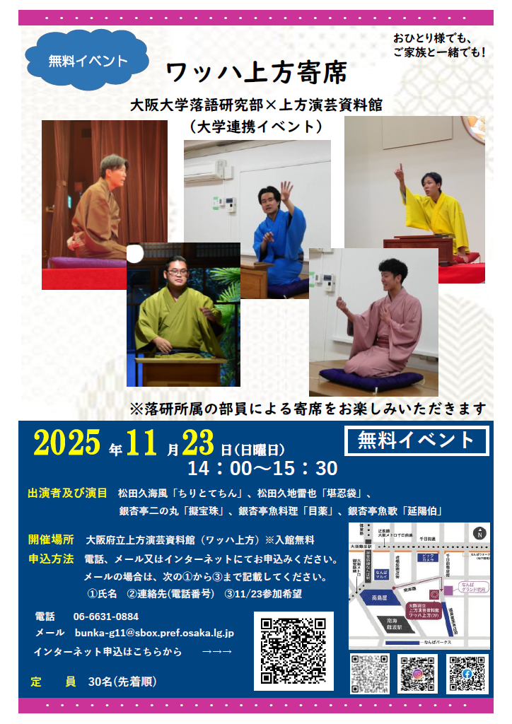 【参加受付中】「大阪大学落語研究部×上方演芸資料館 ワッハ上方寄席」開催のお知らせ(令和7年11月23日(日曜日))