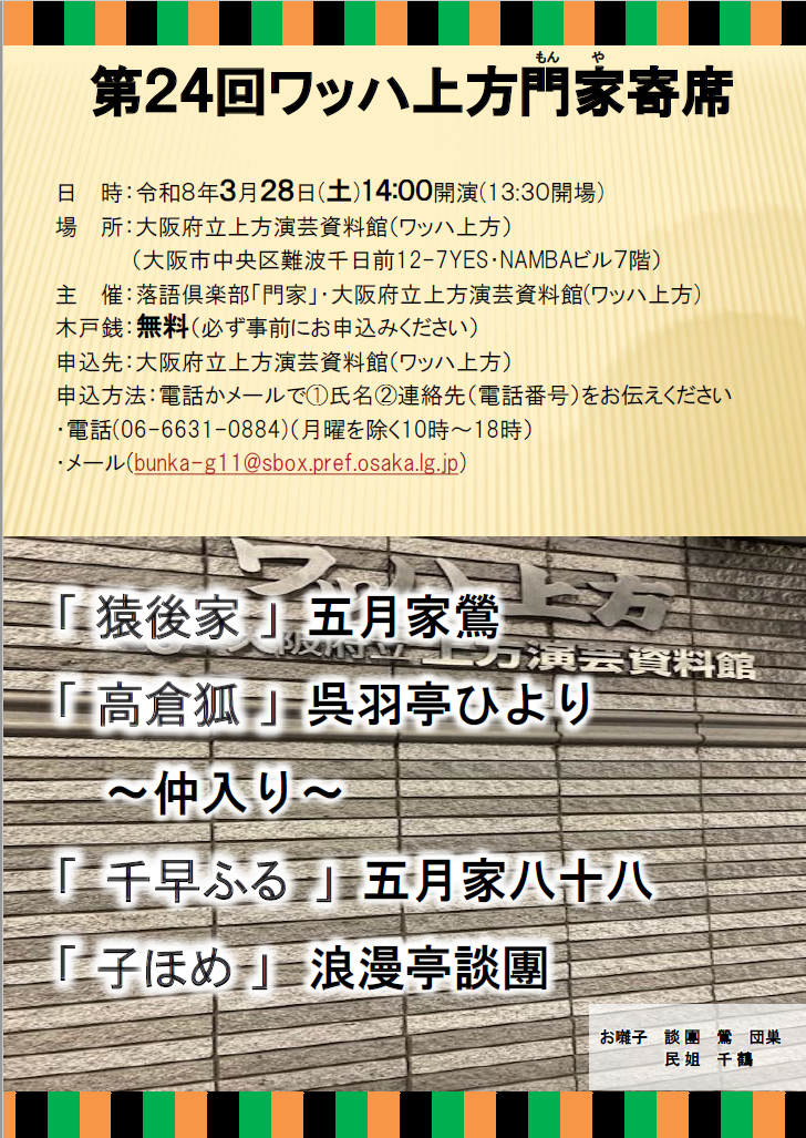 【参加受付中】「第24回ワッハ上方門家寄席」開催のお知らせ(令和8年3月28日(土曜日))