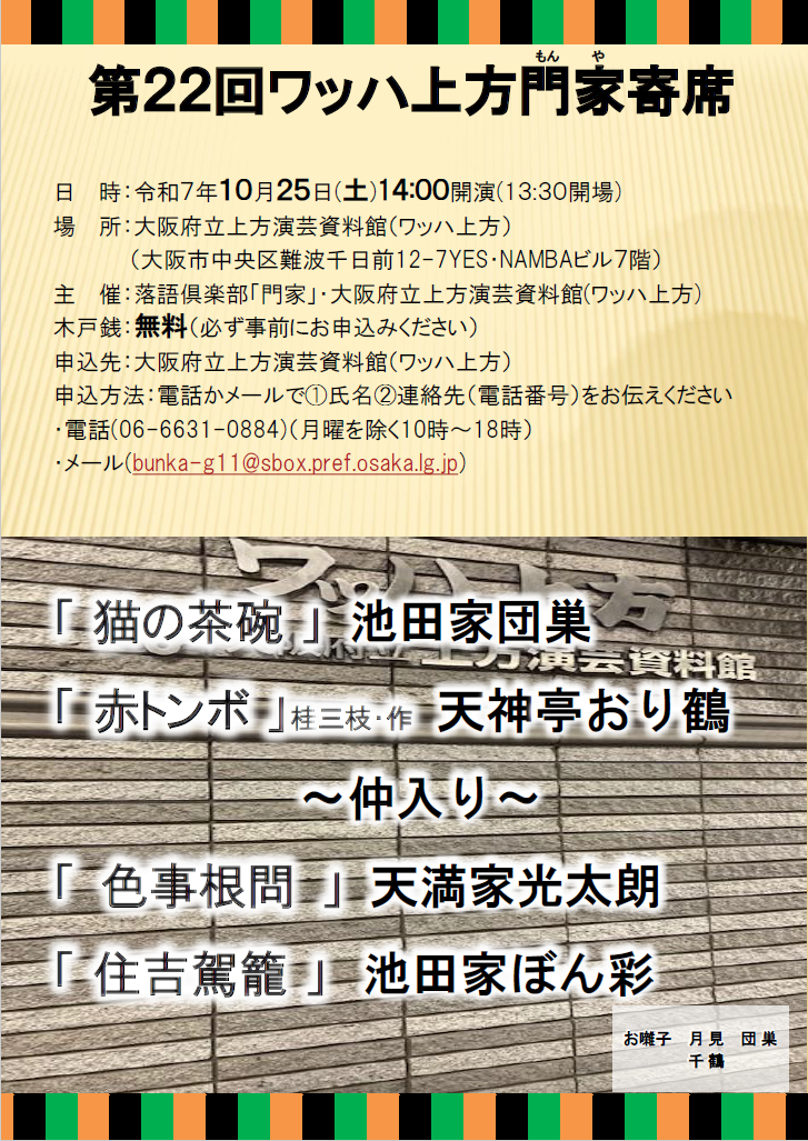 【参加受付中】「第22回ワッハ上方門家寄席」開催のお知らせ(令和7年10月25日(土曜日))