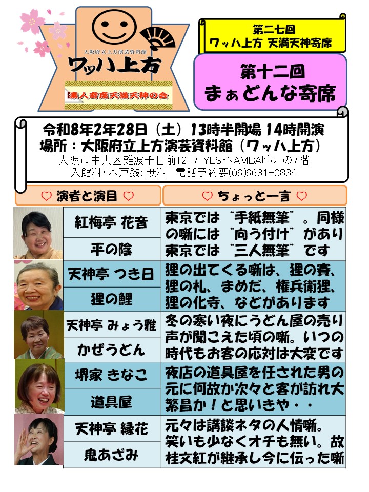 【参加受付中】「第27回ワッハ上方天満天神寄席」開催のお知らせ(令和8年2月28日(土曜日))